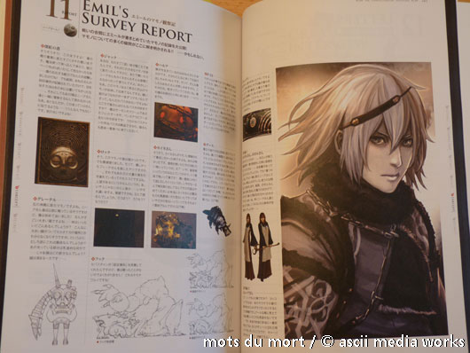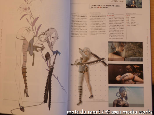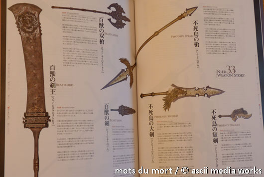 Une seconde partie (4 pages) revient sur le schéma des évènements se déroulant dans le jeu (une sorte de chronologie). La troisième partie se penche sur les armes de NieR (design et histoire des 34 armes disponibles)avant qu'une quatrième et dernière partie ne s'attarde sur quelques back-stories, celle d'Emile, les lettres reçues durant le jeu, et une interview des producteurs illustrée par les costumes alternatifs (en eptit, mais ils sont là) à débloquer dans le DLC.